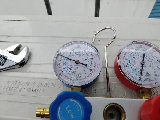 シンク引きが終わったら、ポンプの電源を切ってマニホールドのゲージ圧の様子を確認します。変化がなければそのまま作業してよいのですが、変化がある場合にはガスが漏れているため、原因を探らなければなりません。ゲージ圧に変化がなければ、そのままガスを補充し、バルブを閉めたら作業完了です。
