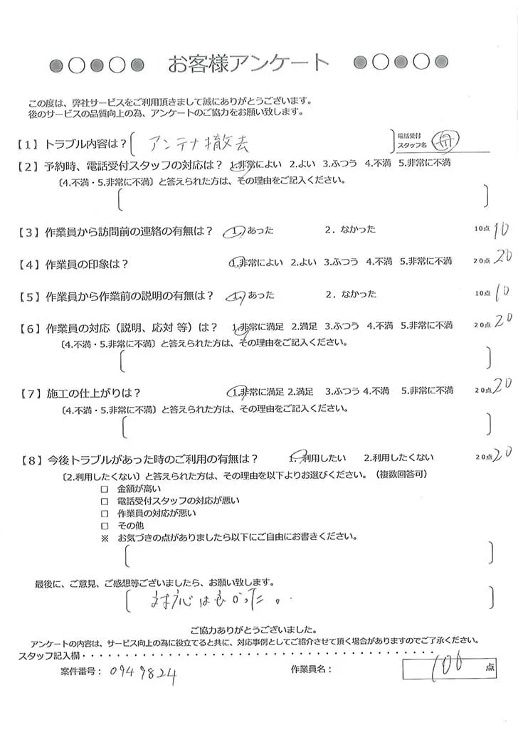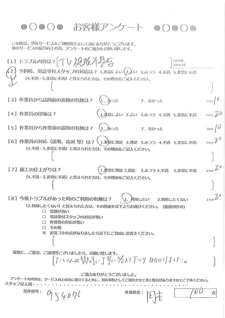 依頼の詳細: テレビが見れないので修理してほしい。また、位置をずらしたいので配線を長くしてほしいとのご依頼。