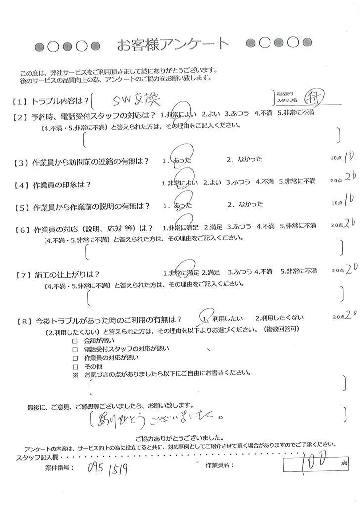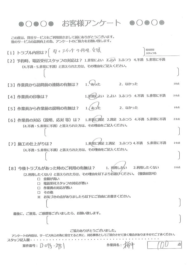 依頼の詳細: 照明スイッチを押しても反応しないので直してほしいとのご依頼。
