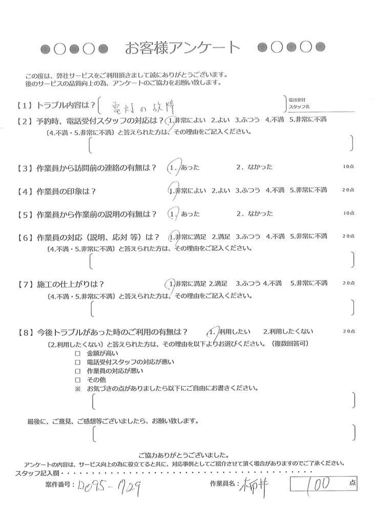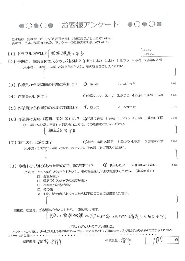 依頼の詳細: 照明が点かなくなってしまった。電球交換してもダメだった