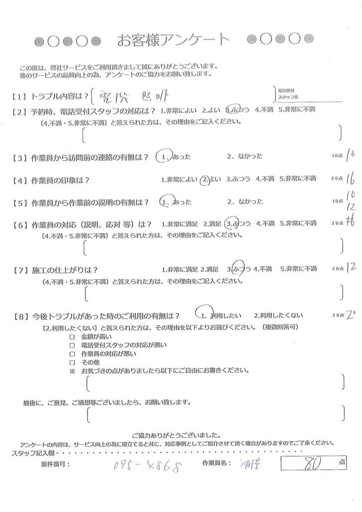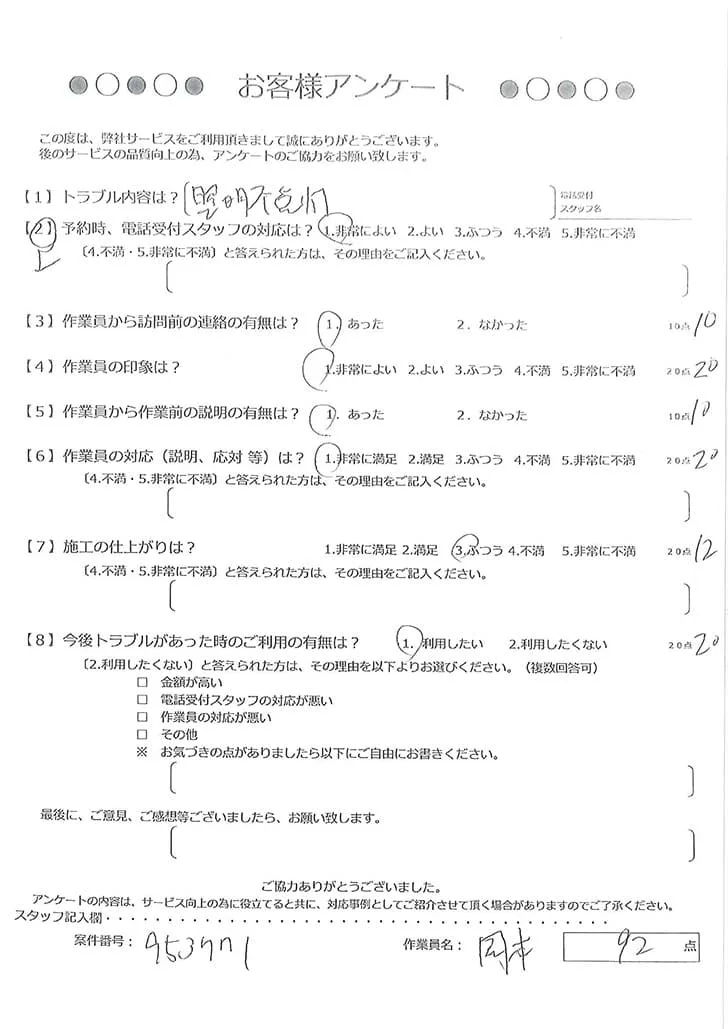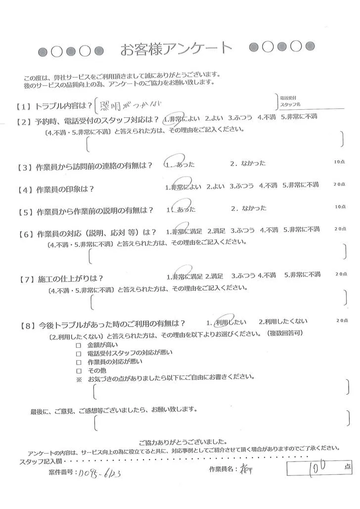 依頼の詳細: 電球交換をしても照明が点かないので調査・修理をしてほしいとのご依頼。