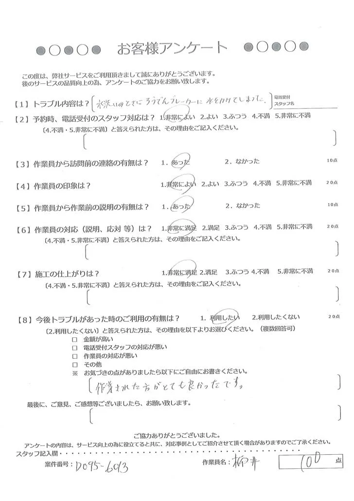 依頼の詳細: ブレーカーに水がかかってしまった。乾かしてはいるがONにできない