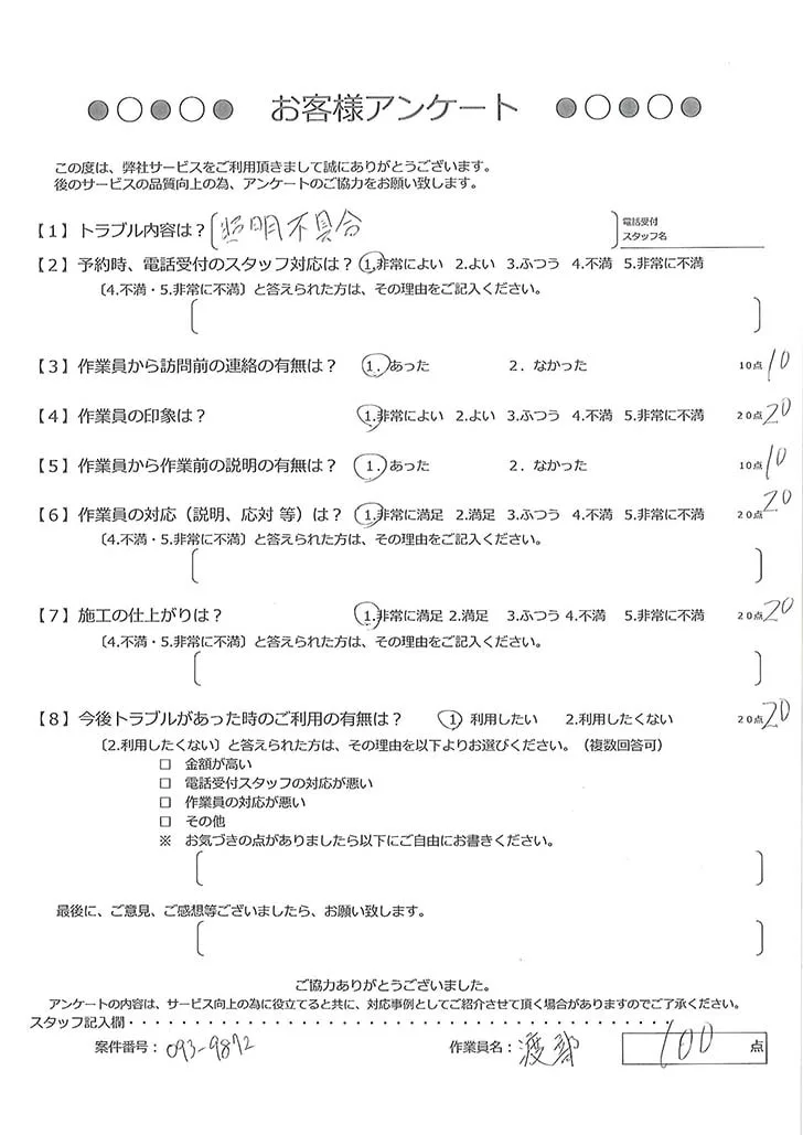 依頼の詳細: 電球交換をしても照明が点かないので直してほしいとのご依頼。