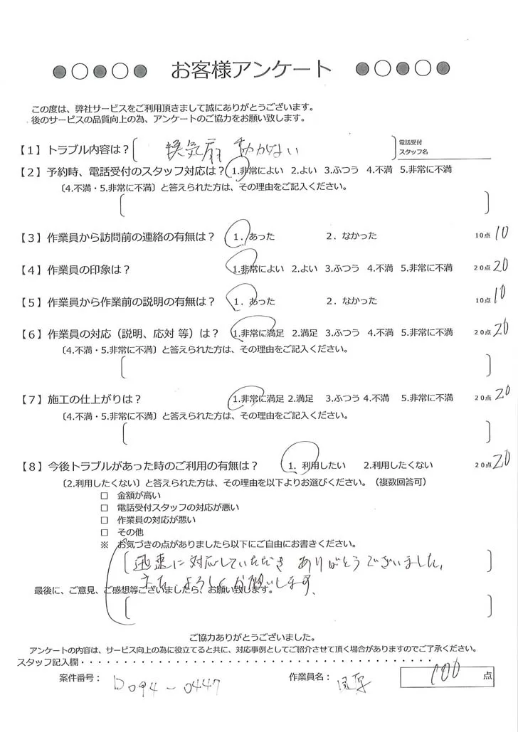依頼の詳細: 換気扇がスイッチを入れても作動しない