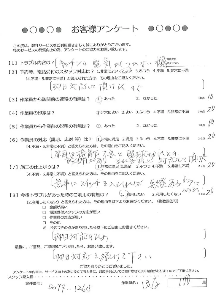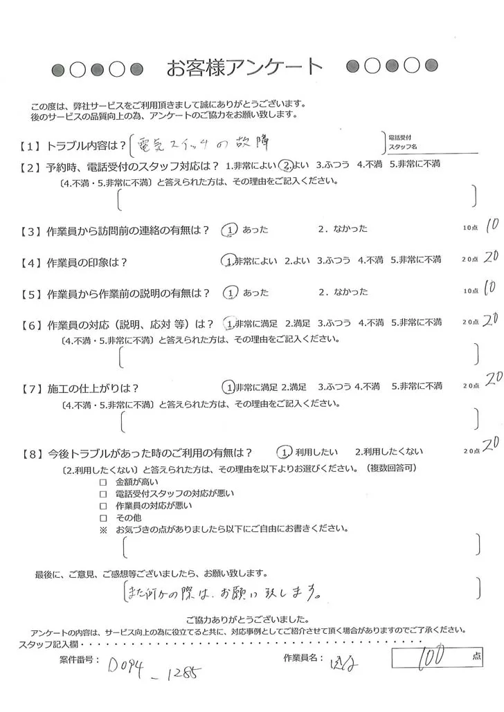 依頼の詳細: 接触不良なのかスイッチを入れても電気が点かないので原因調査をしてもらいたいとのご依頼。