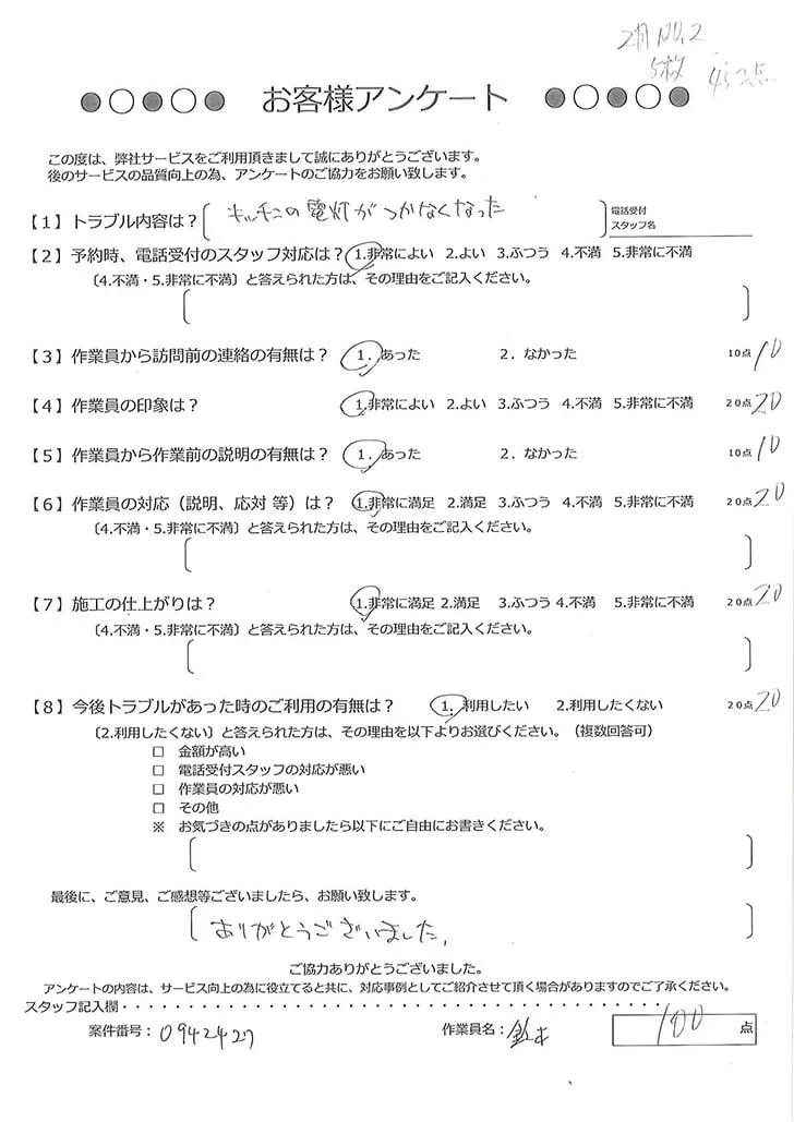 『キッチン照明不点灯』