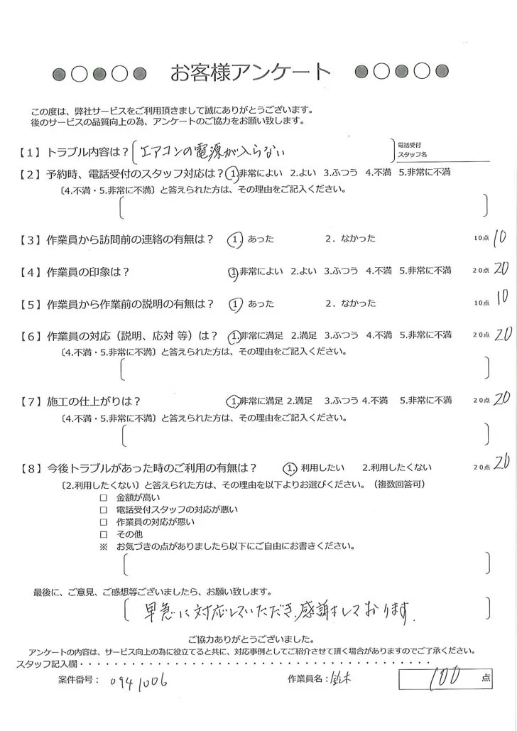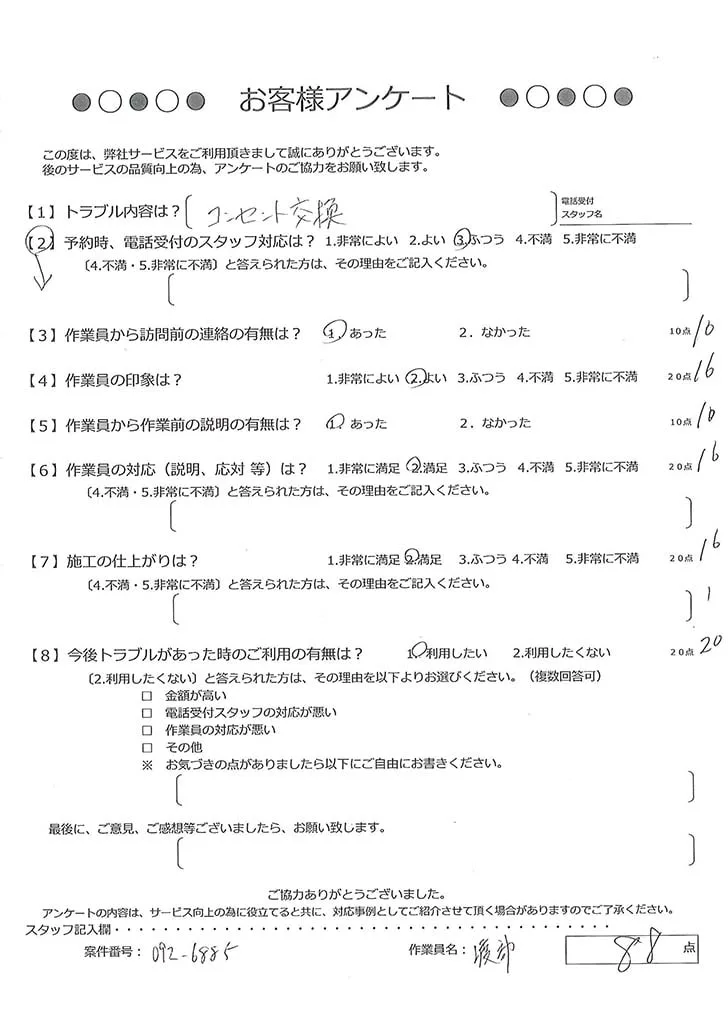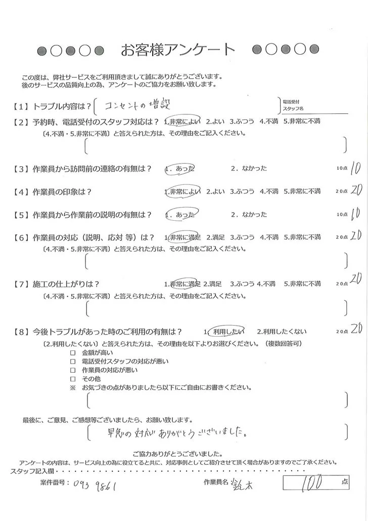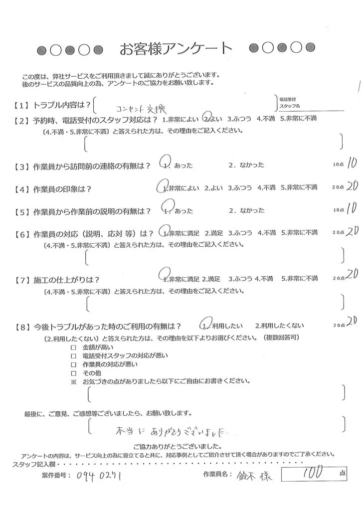 依頼の詳細: コンセントが通電しないのでみてほしい、長年使ってるので寿命かもしれないとのこと。