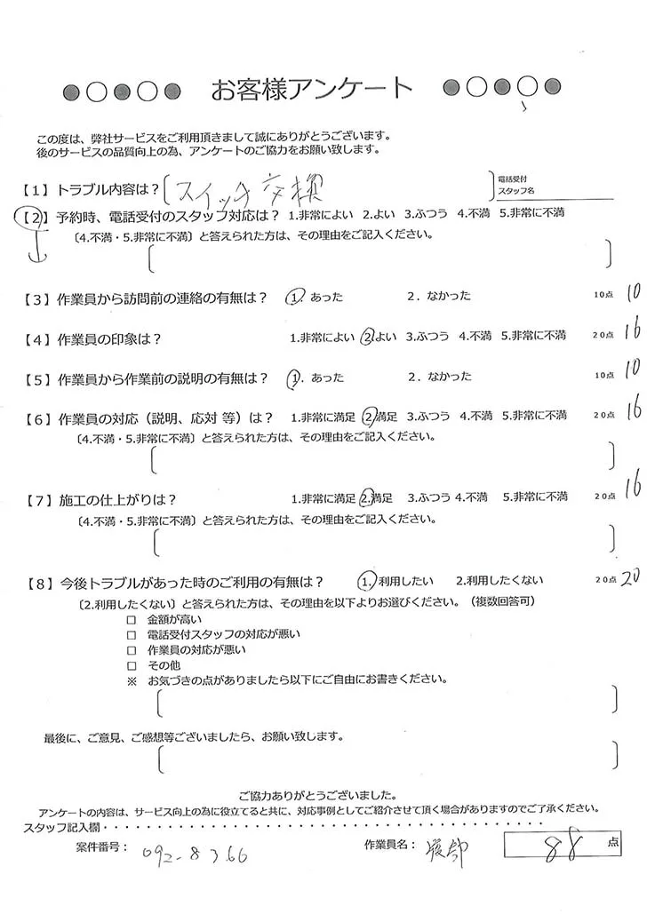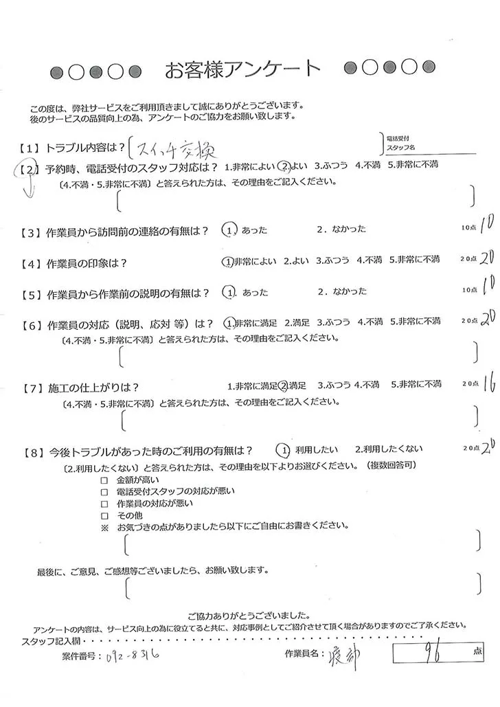 依頼の詳細: 玄関スイッチ故障して照明が点けれないとのこと。