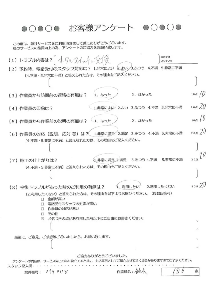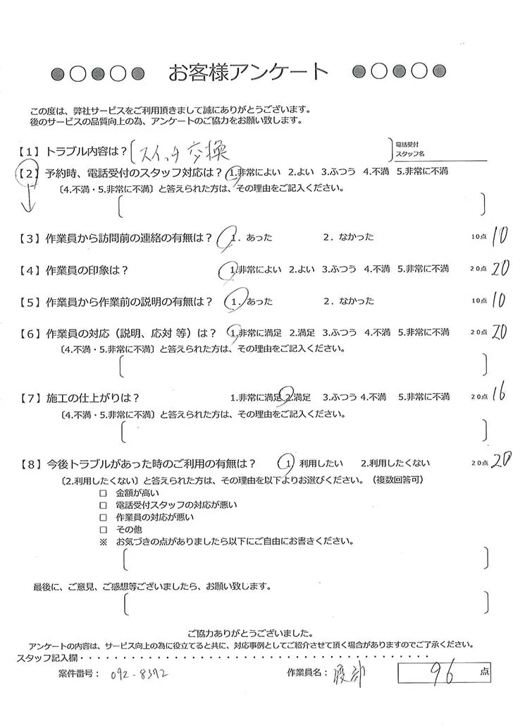 依頼の詳細: 照明スイッチがおかしくなってるので修理化交換してもらいたいとのご依頼。