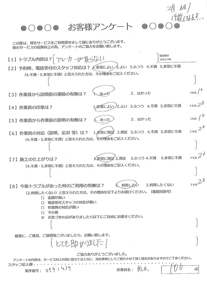 依頼の詳細: ブレーカーが落ちて電気が全部点かず、上げても戻らない