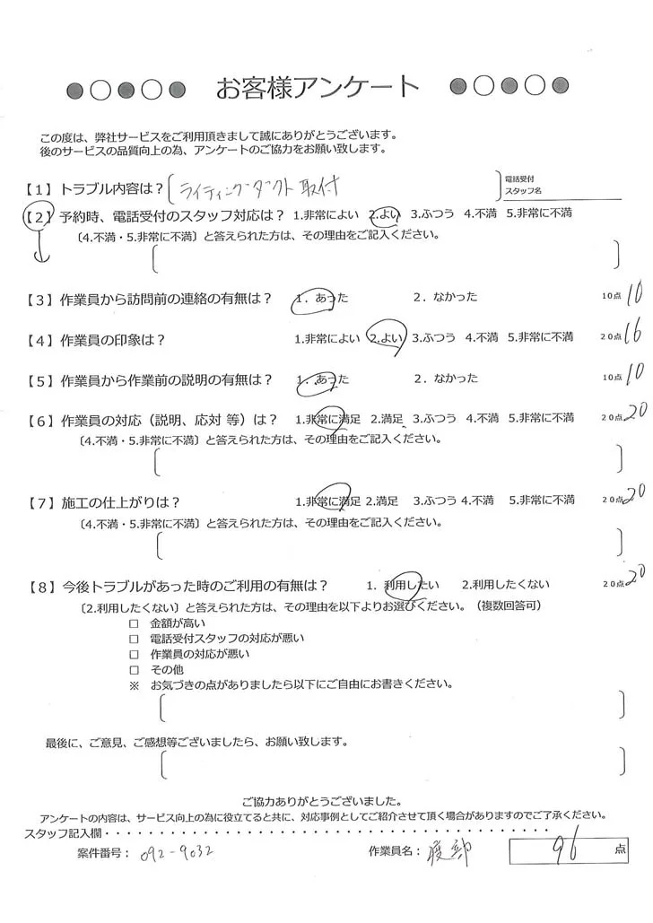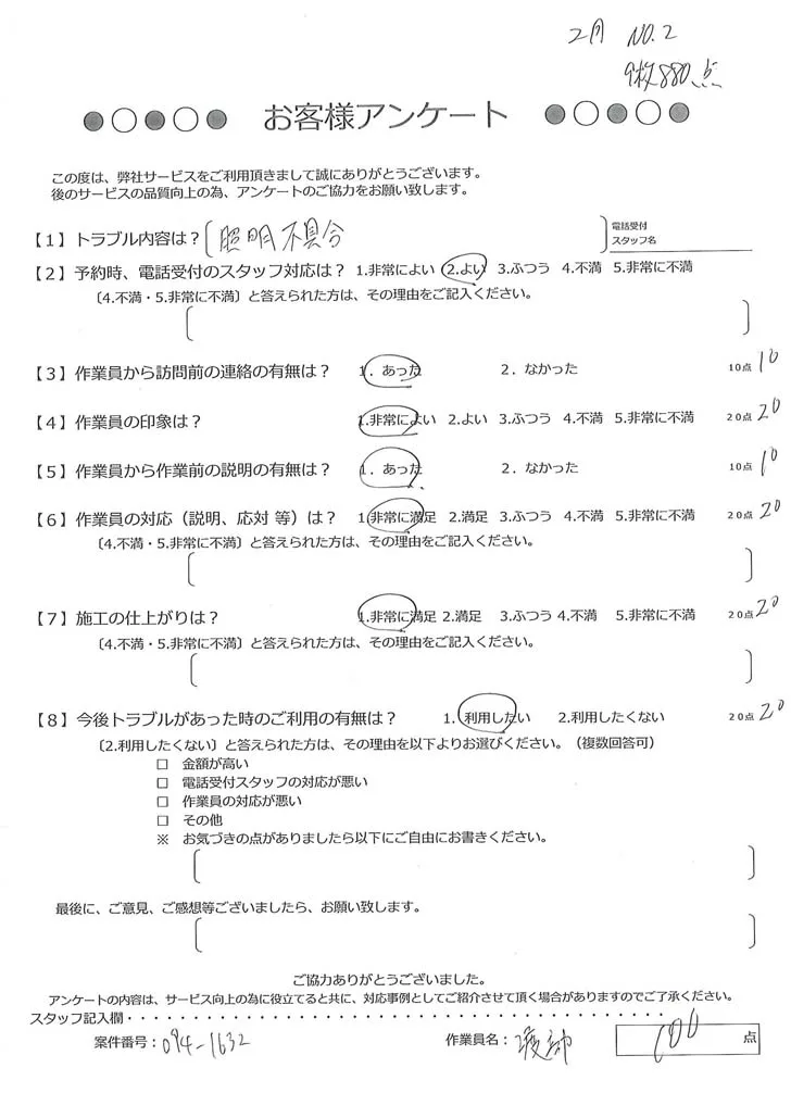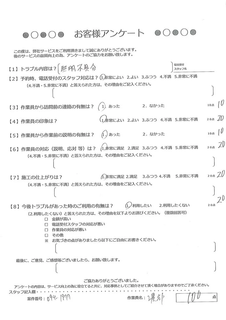 依頼の詳細: ブレーカーをいじっても蛍光灯が全部つかないとのこと。