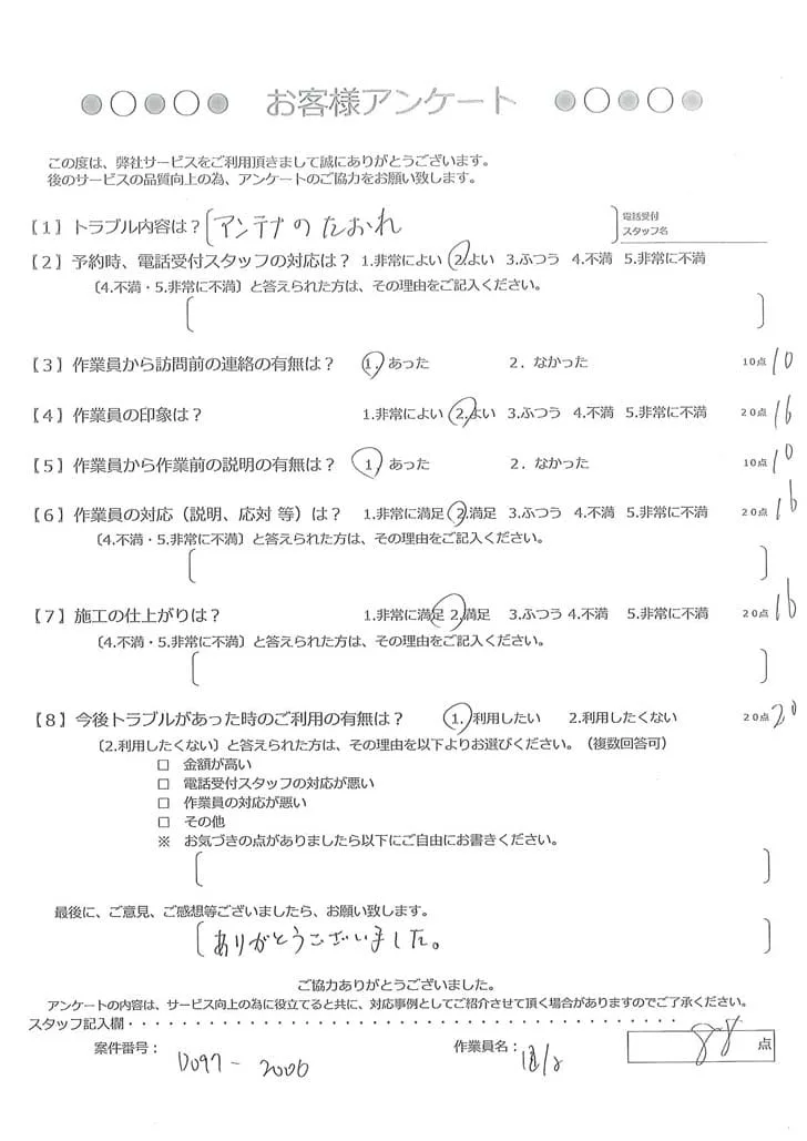 依頼の詳細: 二階の屋根に付いているアンテナが風で倒れているので、撤去し欲しい