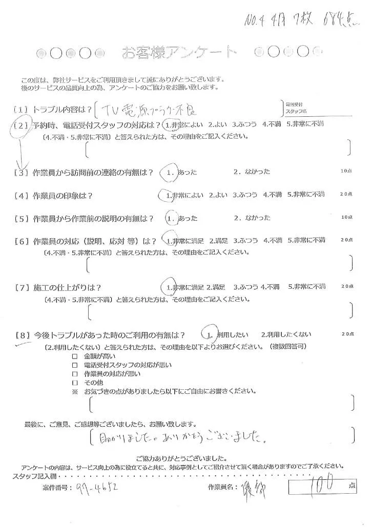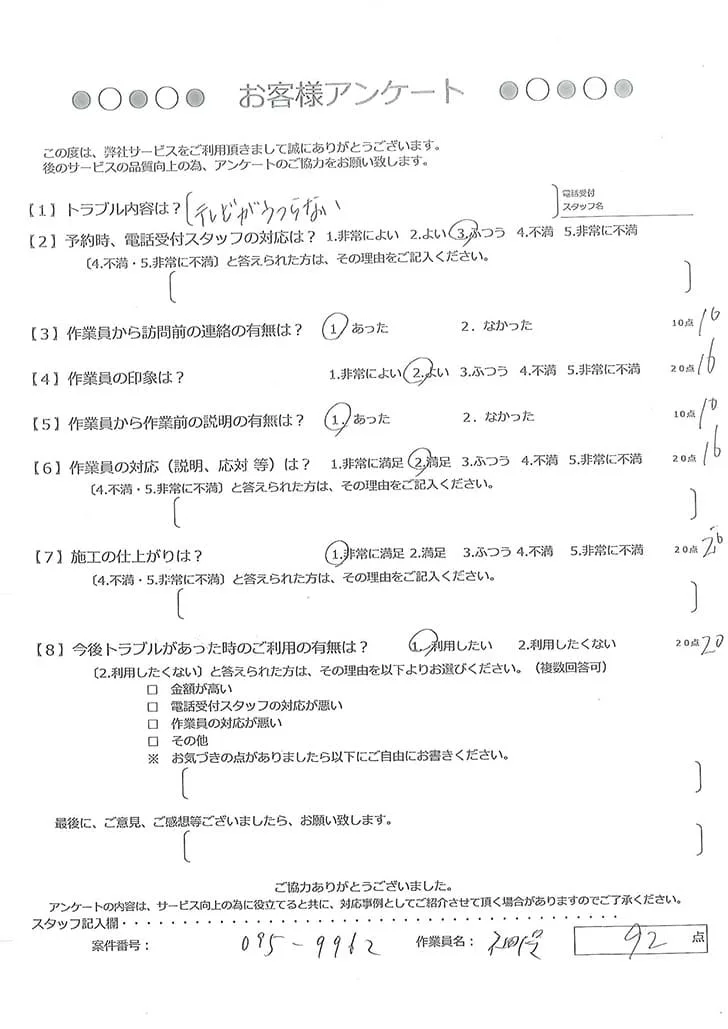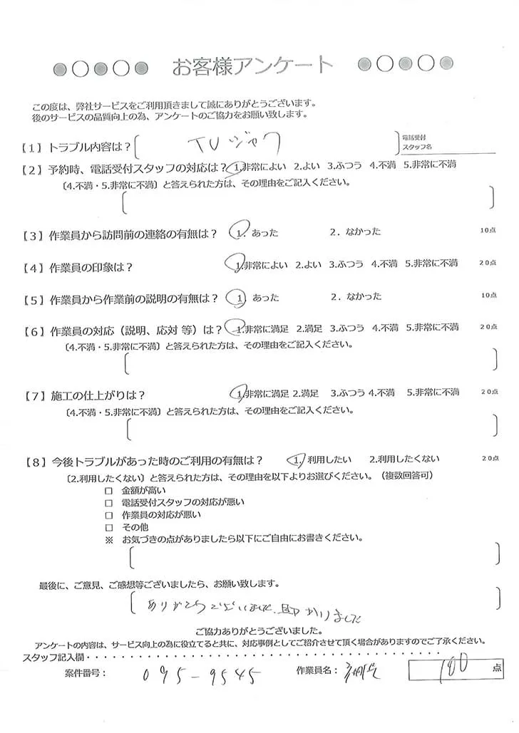 依頼の詳細: テレビの一部チャンネルが映らないのでみてほしいとのご依頼。