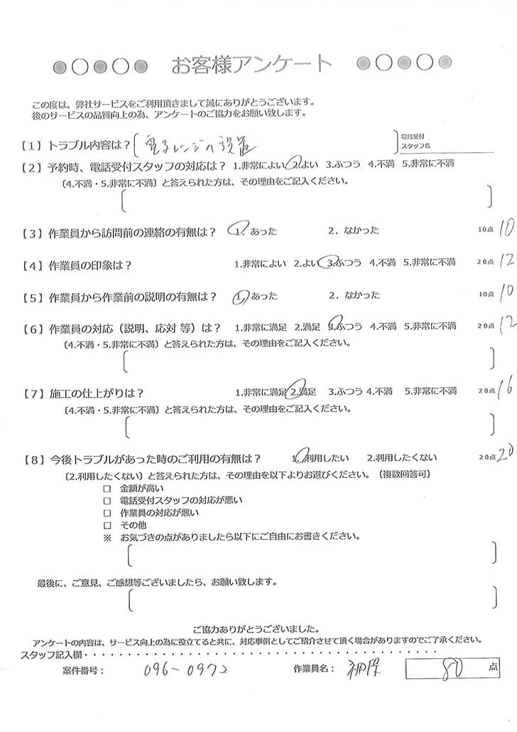 依頼の詳細: 電子レンジをレンジ台に設置してアース線をつないでほしいとのご依頼。