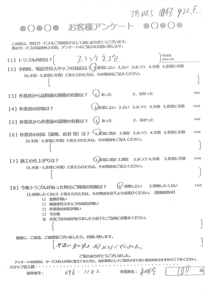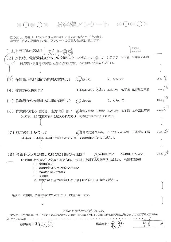依頼の詳細: 浴室、脱衣所の埋め込みスイッチが故障しているのでみてほしいとのご依頼。